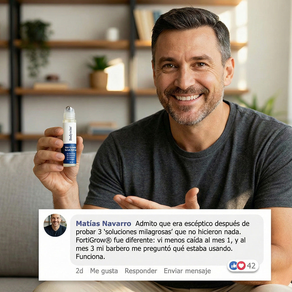 Muchos productos para el crecimiento capilar son grasosos, difíciles de aplicar o solo funcionan en áreas grandes, sin precisión. FortiGrow®, en cambio, está diseñado para actuar justo donde el afinamiento comienza: entradas, coronilla y línea frontal. Su formato roll-on permite una aplicación limpia y precisa, y su fórmula ligera se absorbe rápido, sin dejar olor ni residuos visibles.